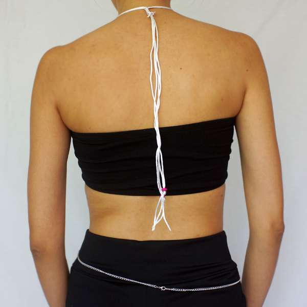 Joya tipo torso tejido a mano artesanalmente en hilo de seda con pedrería ymostacillas con aluminio, ajustable en la parte de atrás. (Talla S-M)