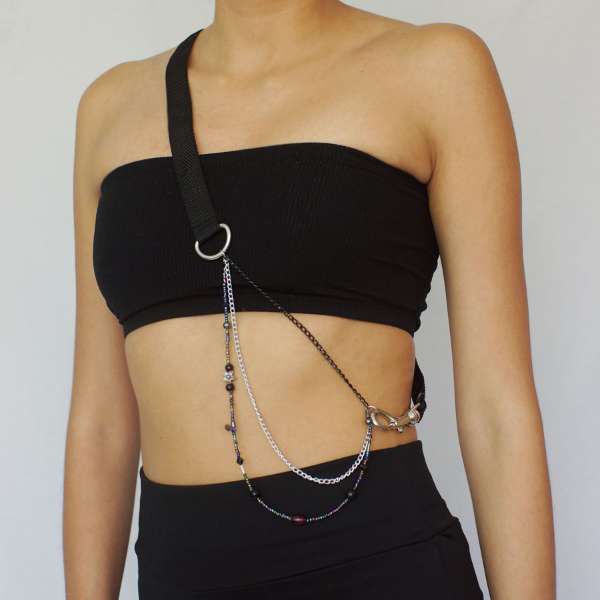 Joya tipo torso elaborado a mano artesanalmente en reata, pedreria y herrajes, talla única no ajustable. (Talla S-M)