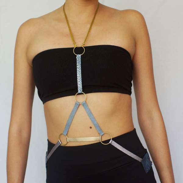 Joya tipo torso elaborado a mano artesanalmente en cuerina con bronce e hilo de seda tejido, ajustable en la parte de atrás. (Talla S-M-L-XL)